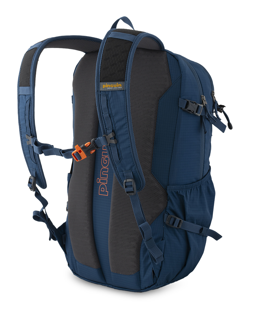 Výškově nastavitelný a odepínatelný hrudní popruh s píšťalkou pro případ nouze.
