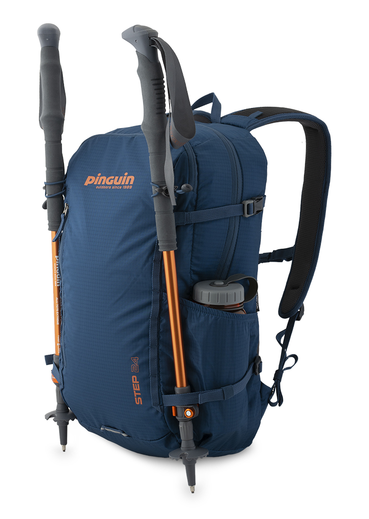 Možnost připevnění trekových holí vložením jejich rukojetí do vnějších síťovaných kapes a zajištěním pruženkou s háčkem.