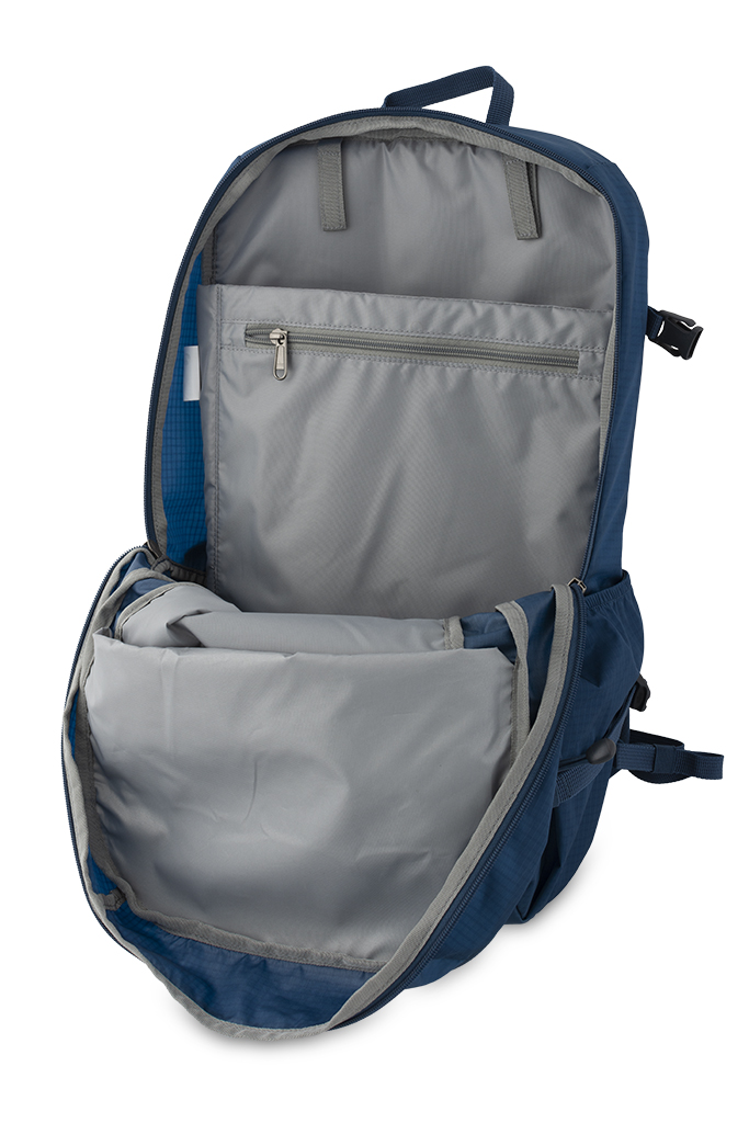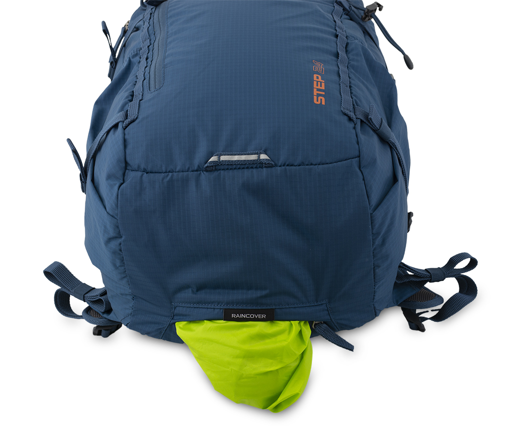 Výrazná pláštěnka v samostatné zipové kapse na dně batohu.
