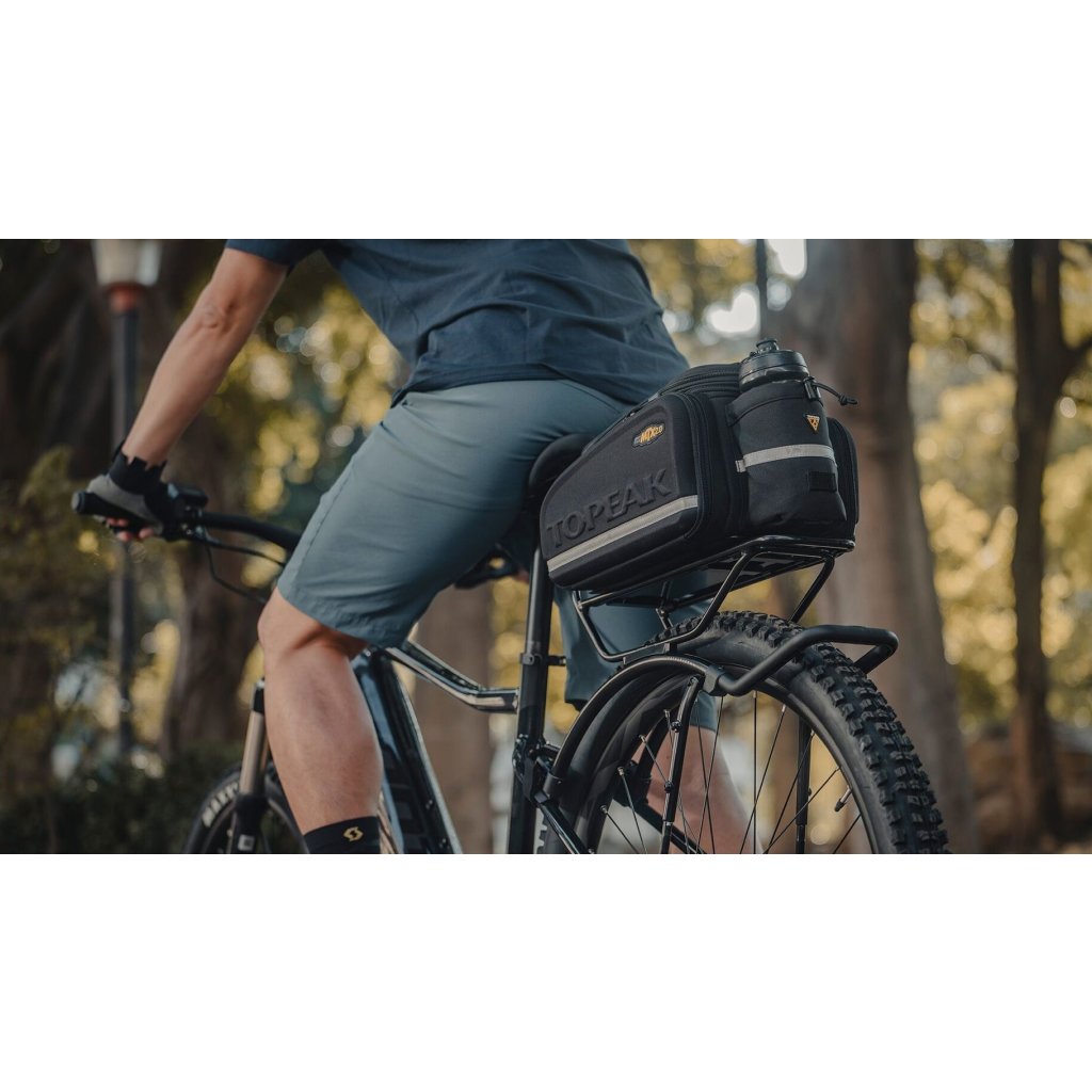 Odolná brašna na zadní nosič s velkou kapacitou. Kromě rozšiřitelné horní části a zadního držáku na láhev se rozšiřují také boční panely na plnohodnotné kapsy a maximalizují tak kapacitu. Brašna kombinuje tvarově stálý materiál s pružnou a odolnou textilii Denier 600.
