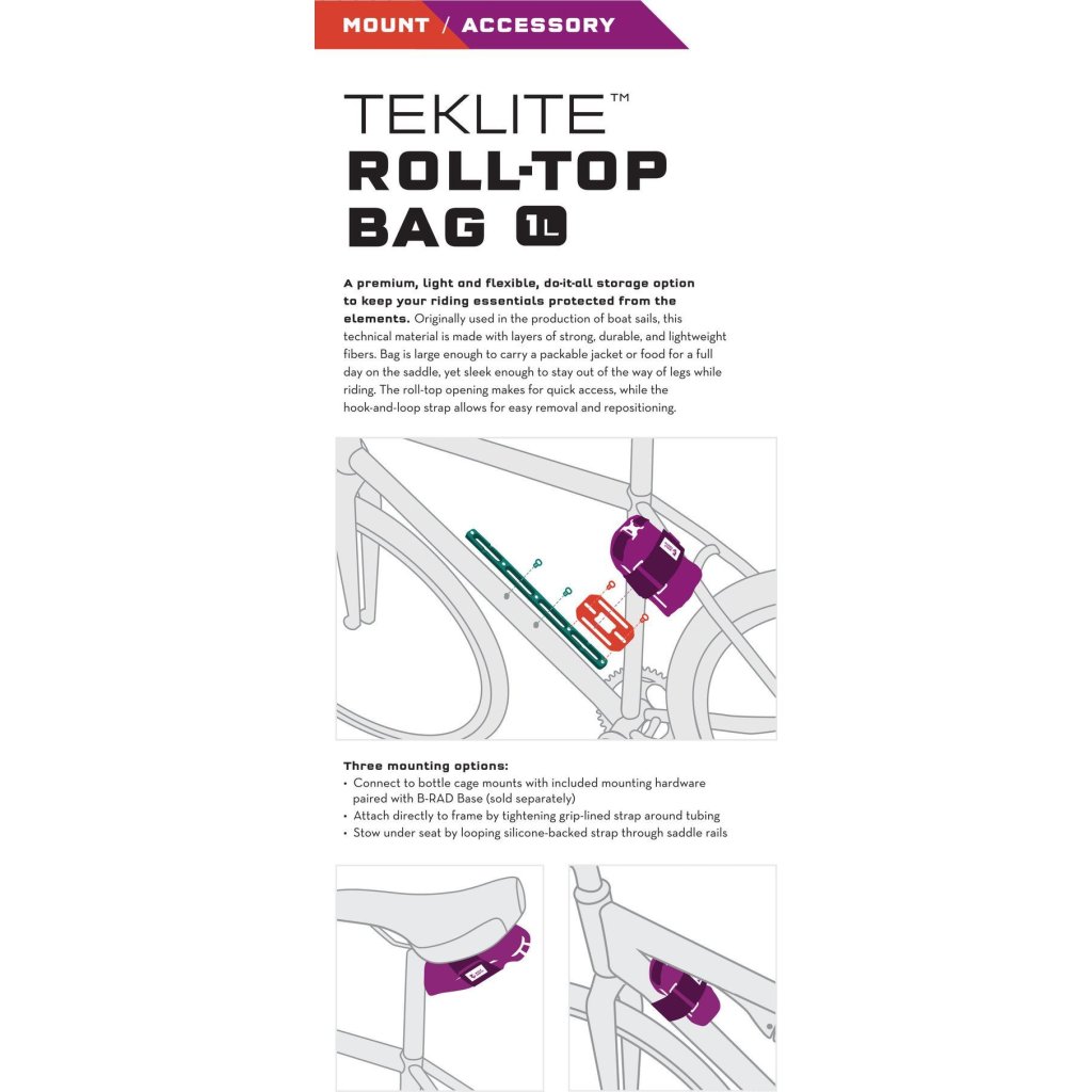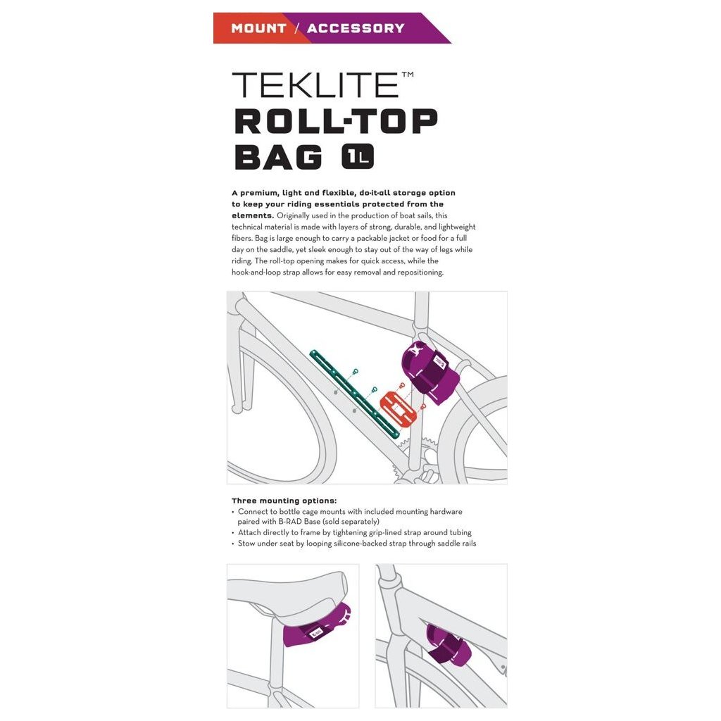 B-RAD TekLite Roll-Top Bag je prémiová, lehká a flexibilní brašnička, která ochrání vaše nezbytnosti, které berete s sebou na kolo před přírodními živly. Má stejný profil jako původní B-RAD Roll-Top Bag, ale používá nový materiál TekLite, který je vyroben z vrstvených, pevných, odolných a lehkých vláken. Brašna jsou dostatečně velká, aby pojmula sbalenou větrovku nebo jídlo na celý den v sedle, ale zároveň dostatečně elegantní, aby při jízdě nepřekážela. Rolovací otvor umožňuje rychlý přístup, zatímco pásek se suchým zipem umožňuje snadné vyjmutí a přemístění. Lze ji připevnit pod sedlo, k rámu, dát do košíku na láhev nebo namontovat na jakoukoli základnu B-RAD.
