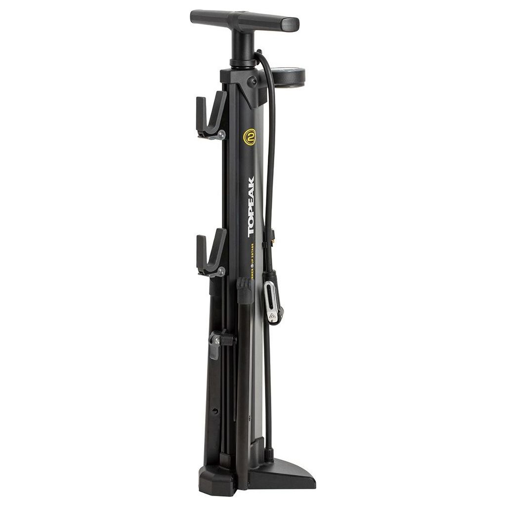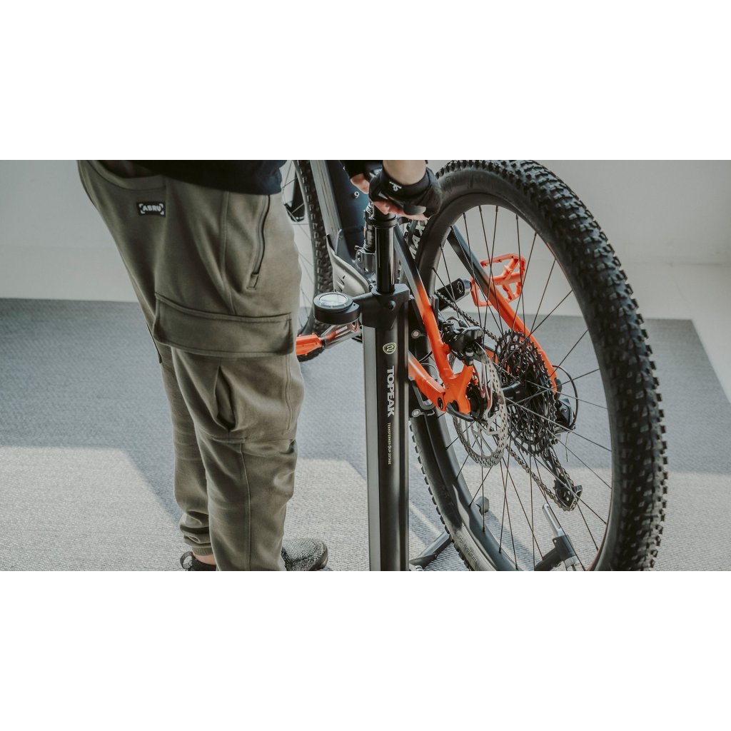 Tento jedinečný přenosný stojan na kolo a podlahová pumpa v jednom je vybaven technologií Topeak 2Stage, která okamžitě dodává velké množství vzduchu pro MTB pneumatiky nebo snadno přepíná do režimu vysokého tlaku pro huštění gravel/silničních pneumatik. Jeho vestavěné výsuvné dlouhé nohy a nastavitelné QR háky poskytují stabilní platformu pro uložení nebo snadnou údržbu jakýchkoli jízdních kol včetně těžkých kol nebo elektrokol.