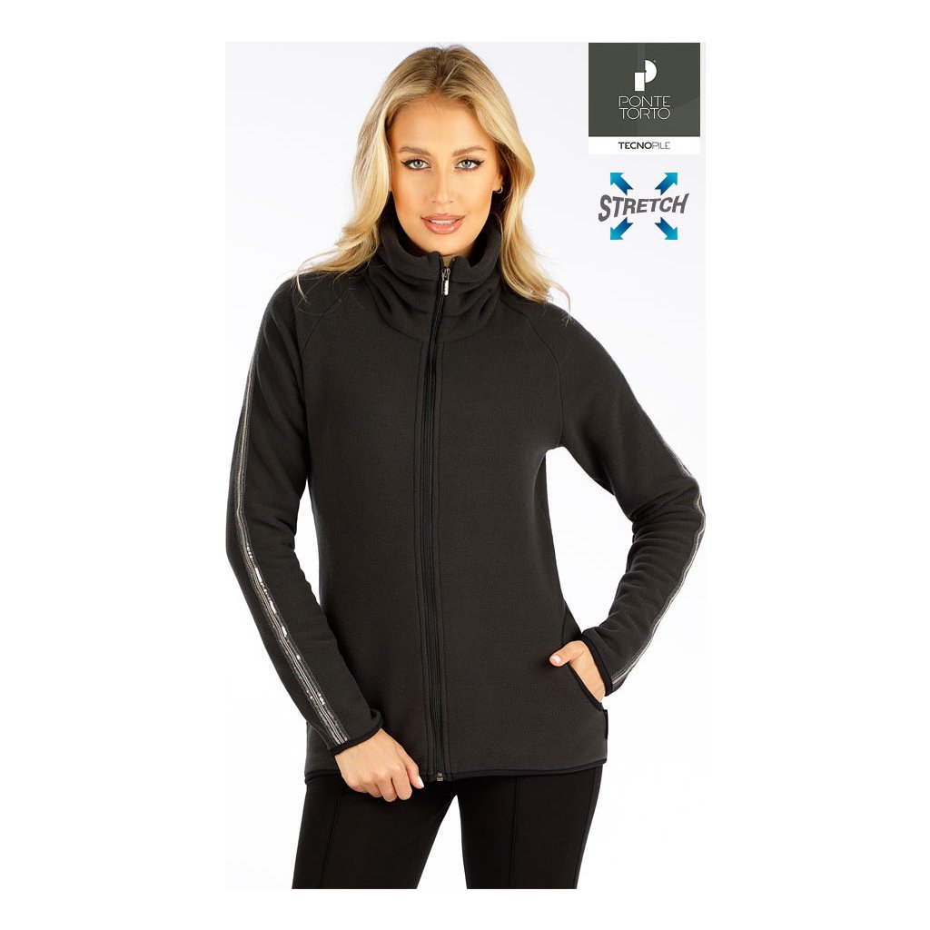 Zapínání na zip. Vysoký límec se sklady. Praktické boční kapsy. Efektivní pružné lemování. Ozdobný třpytivý pruh na rukávech. Rychleschnoucí materiál s výbornými termoizolačními vlastnostmi, který nestárne a nežmolkuje. Pružnost oběma směry zaručuje dokonalou volnost pohybu. Vhodný jako druhá vrstva oblečení. Fleece velmi vysoké kvality.