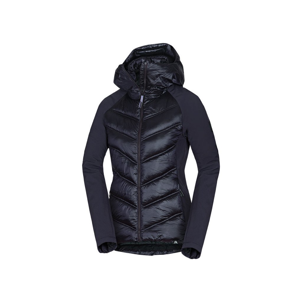 Dámská hybridní izolující bunda se softshellovými částmi je ideální do chladného, spíše suchého a větrného počasí během podzimu, zimy a jara. Je navržena pro turistiku, volný čas či cestování. Softshellové části zvyšují odolnost bundy proti nečasu. Izolace bundy je zajištěna pomocí syntetického rouna, které je měkké, prodyšné a napodobuje vlastnosti chmýří. Oproti chmýří je však syntetická výplň odolnější vůči nasákání vlhkosti, a ani při částečném navlhnutí neztrácí své izolační vlastnosti. Bunda disponuje dvěma bočními kapsami na zip, zipovatelným zakončením rukávů, regulací spodního okraje na stahování a fixní 3D kapucí.