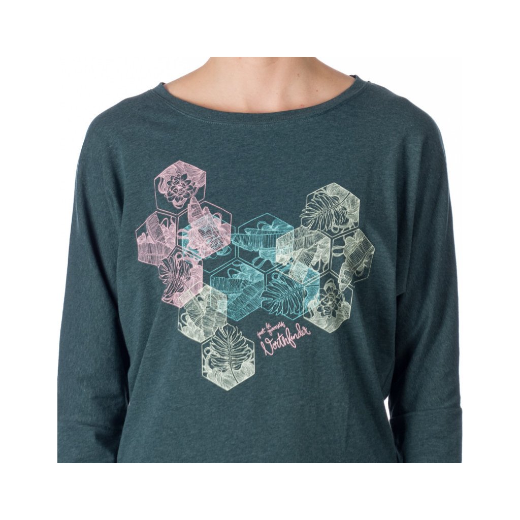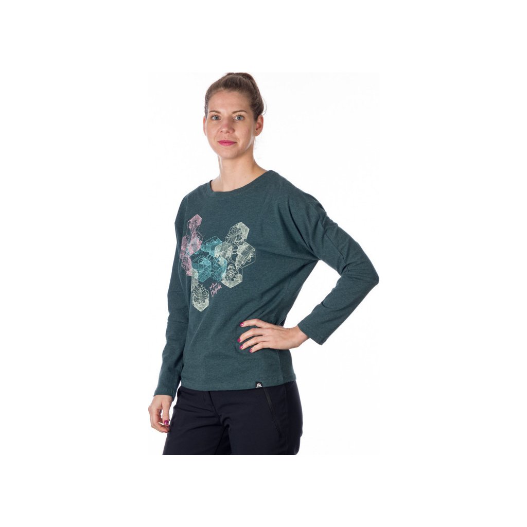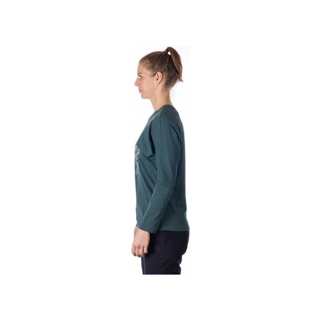Dámské tričko z bavlněné směsi je vhodnou volbou pro různé volnočasové aktivity, ať už ve městě nebo na horách. Triko zdobí originální potisk. Materiál je dobře prodyšný a je ošetřen silikonovo-enzymovým předpíráním, díky kterému si zachovává svůj tvar a je příjemný na dotek. Triko s dlouhými rukávy a kulatým výstřihem je vhodné pro všechny typy postav.