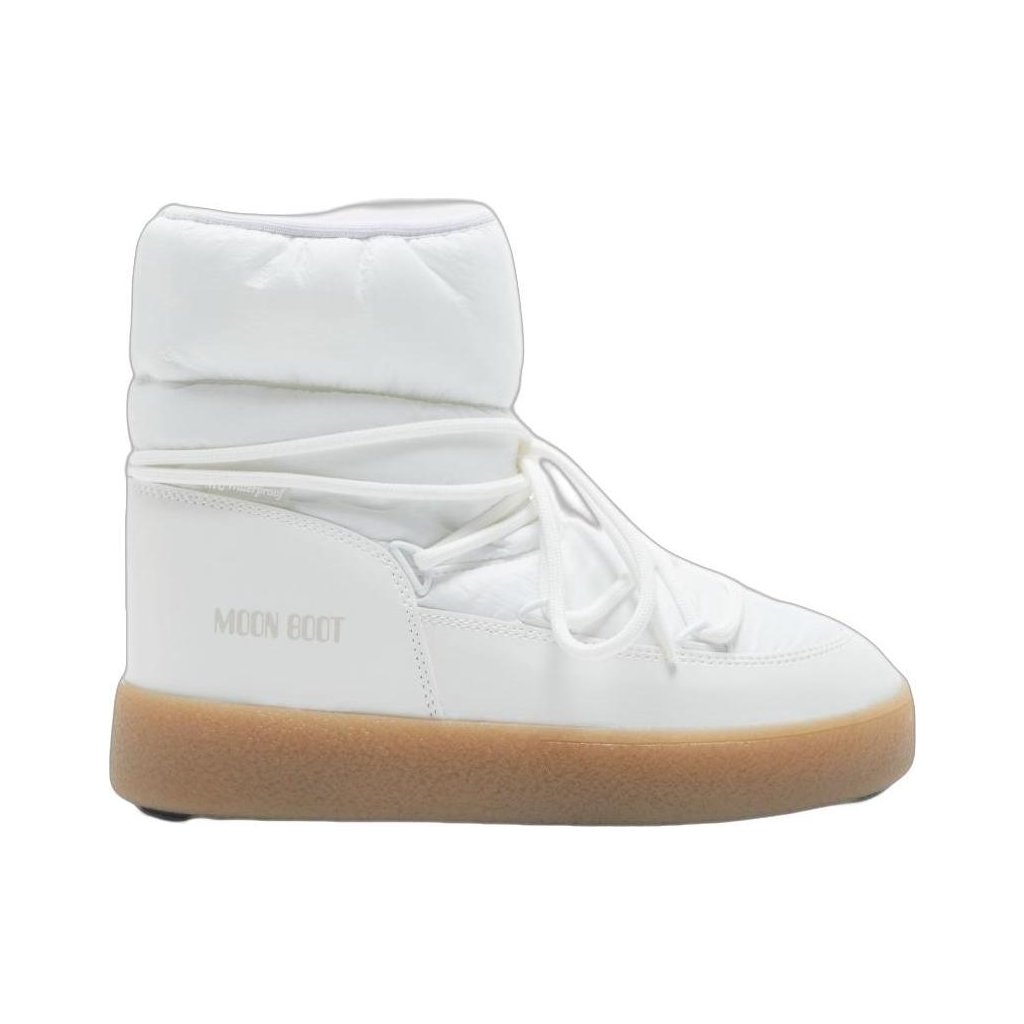 Dámské vysoké boty Moon Boot. Bílé městské sněhule s dekorativními šňůrkami a kovovými očky. Námořenský styl doplňuje logo Moon Boot. Boty s termoplastickou mezipodešví nabízejí voděodolnost a jsou módním ikonou zimní sezóny.