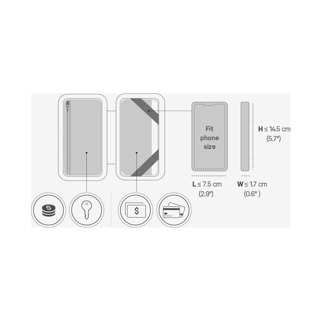 | Kapacita: | Pro smartphony ≤ 14.5 x 7.5 x 1.7 cm, platební karty, bankovky, mince a klíče |