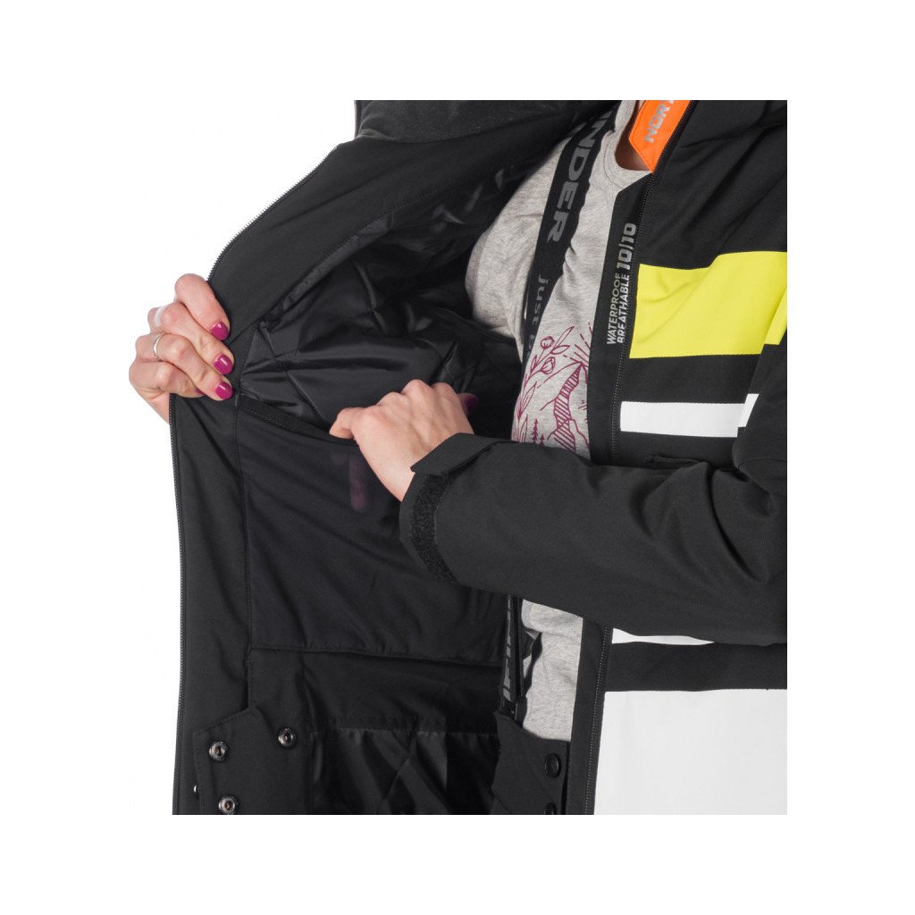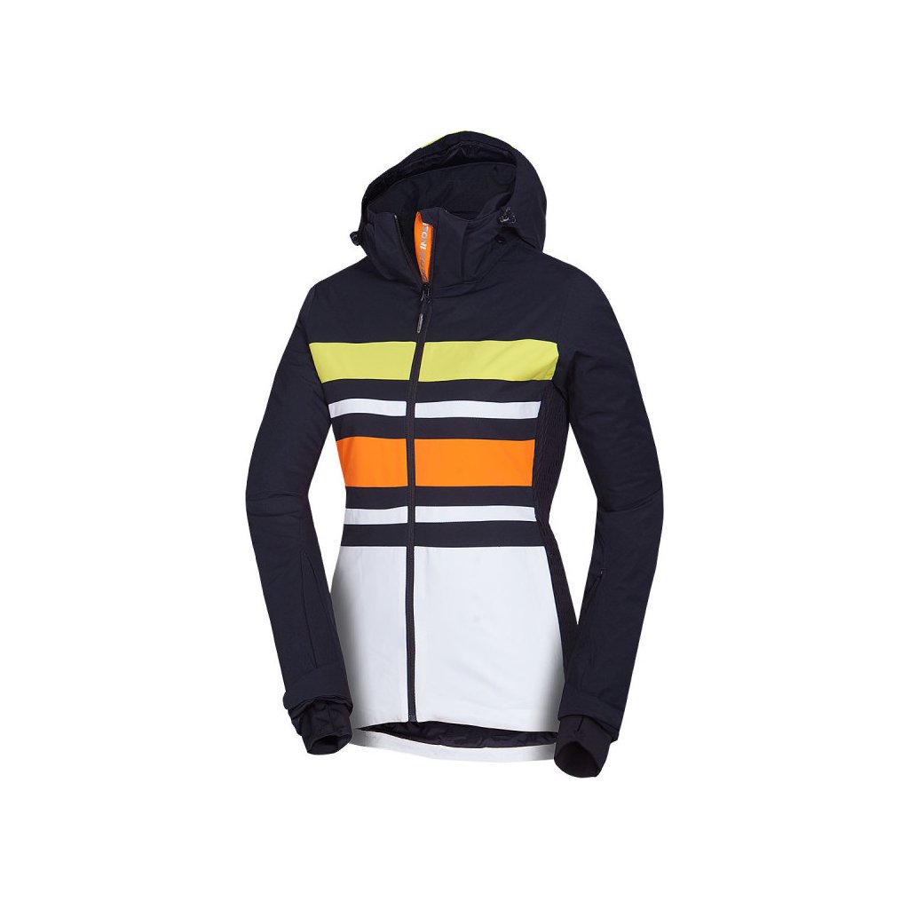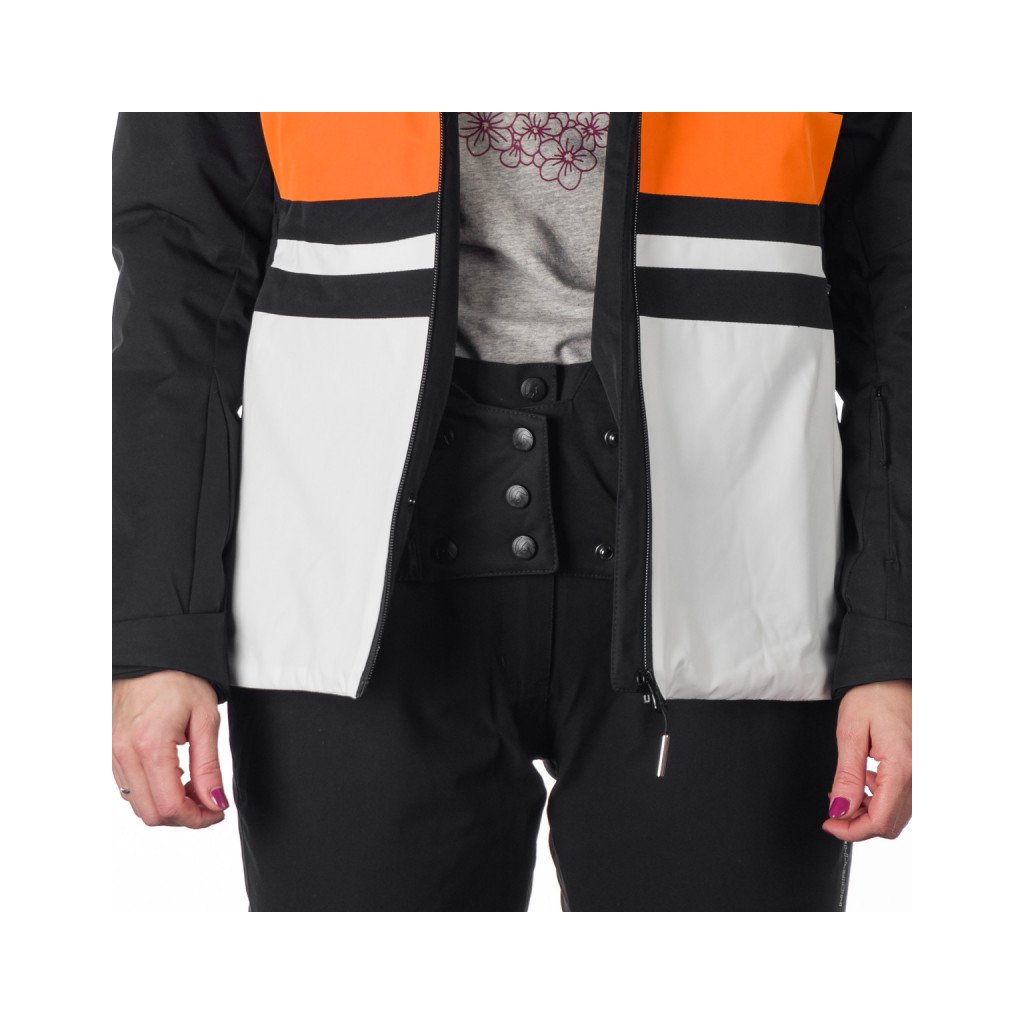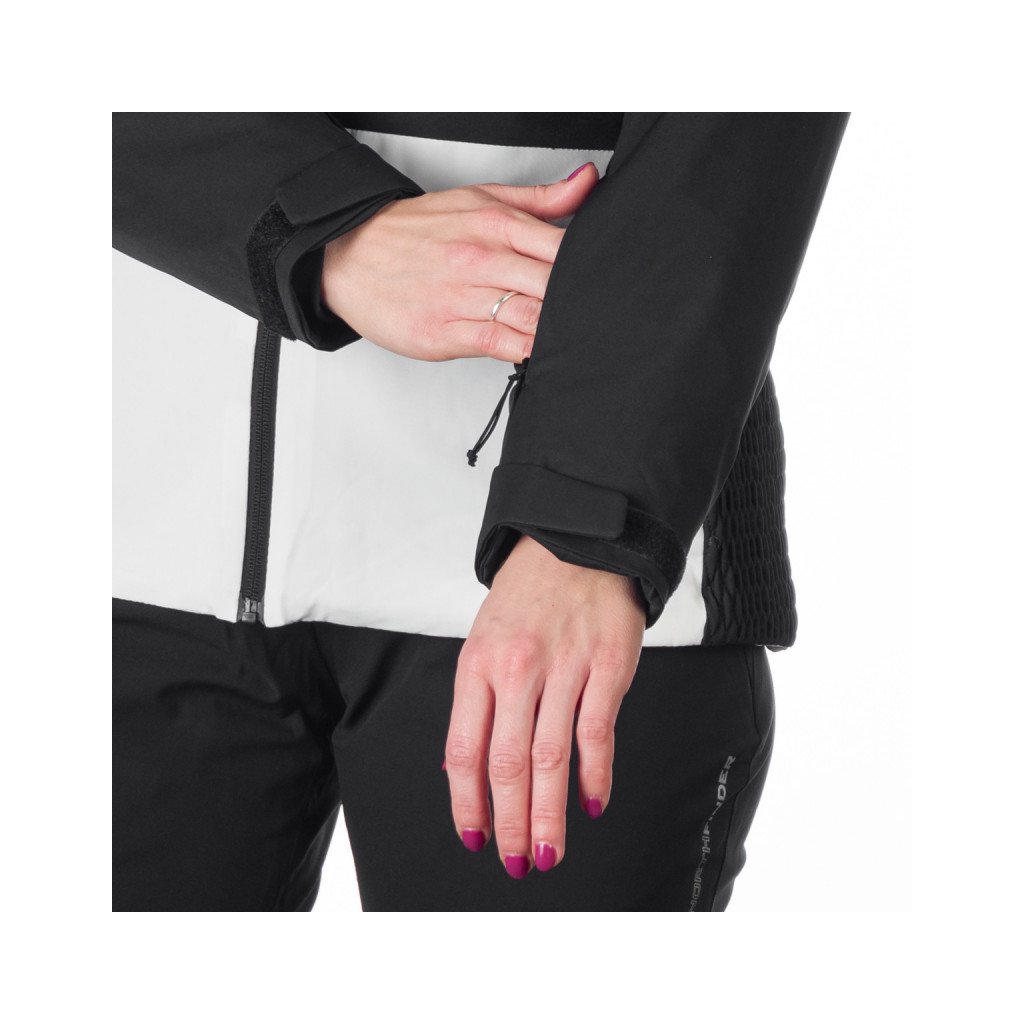 Dámská lyžařská bunda dokonale připravená pro zimní počasí, sněžení i vítr. Přináší trendový design spolu s pokročilými technickými funkcemi a pohodlím. Je vyrobena z vysoce strečového 2-vrstvého materiálu s membránou a hodnotami 10 000 mm H₂O / 10 000 g/m²/24 h, díky čemuž dobře odolává větru i vodě při zachování výborné prodyšnosti. Pro podporu vodoolnosti jsme podlepili kritické švy. Materiál byl navíc ošetřen ekologickou vodoodpudivou WR úpravou (PFC free). Tepelný komfort je navíc zapezpečen díky léze proti profouknutí pod zipem a sněhovému pásu, který chrání před vniknutím sněhu dovnitř bundy. Komfort při nošení zvyšují předtvarované rukávy a možnost nastavení obvodu rukávů na suchý zip s vnitřní vsadkou z lycry. Bunda je také vybavena nastavitelným pásem a možností regulace spodního okraje stahováním, můžete si tedy bundu přizpůsobit vašim potřebám. K dispozici jsou dvě praktické boční kapsy na zip, kapsa na rukávu na skipass a vnitřní hrudní kapsa na zip. Další vnitřní kapsa je určena k uložení lyžařských brýlí. Odnímatelná a nastavitelná 3D kapuce umožňuje přizpůsobení podle počasí a preferencí.