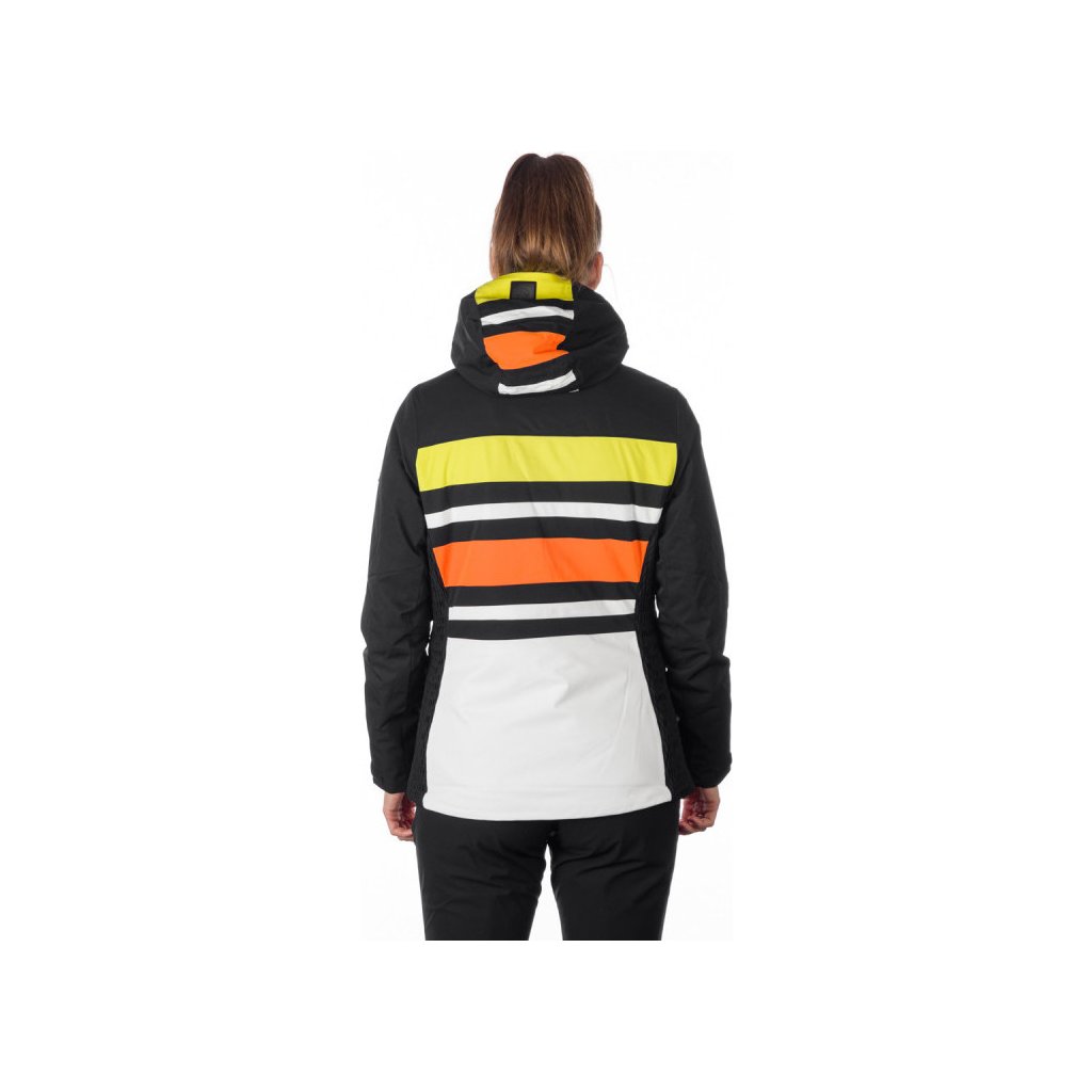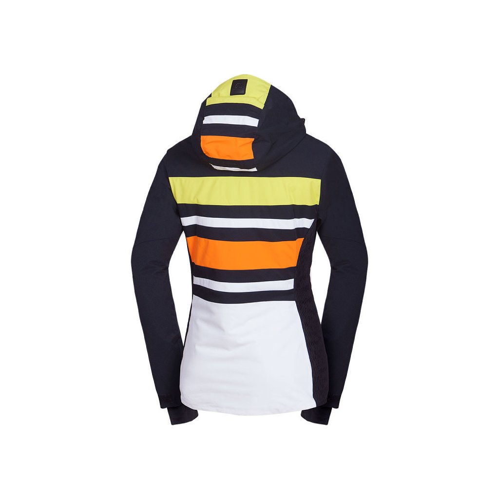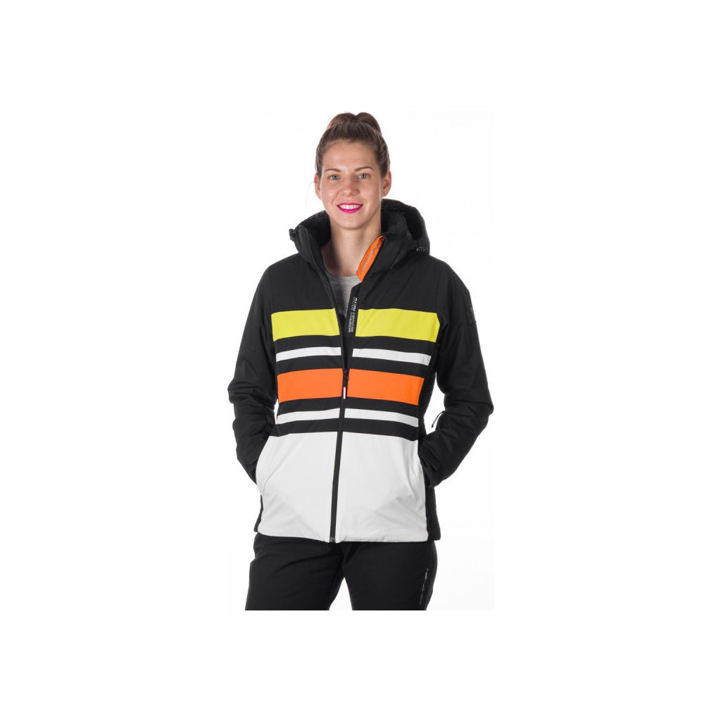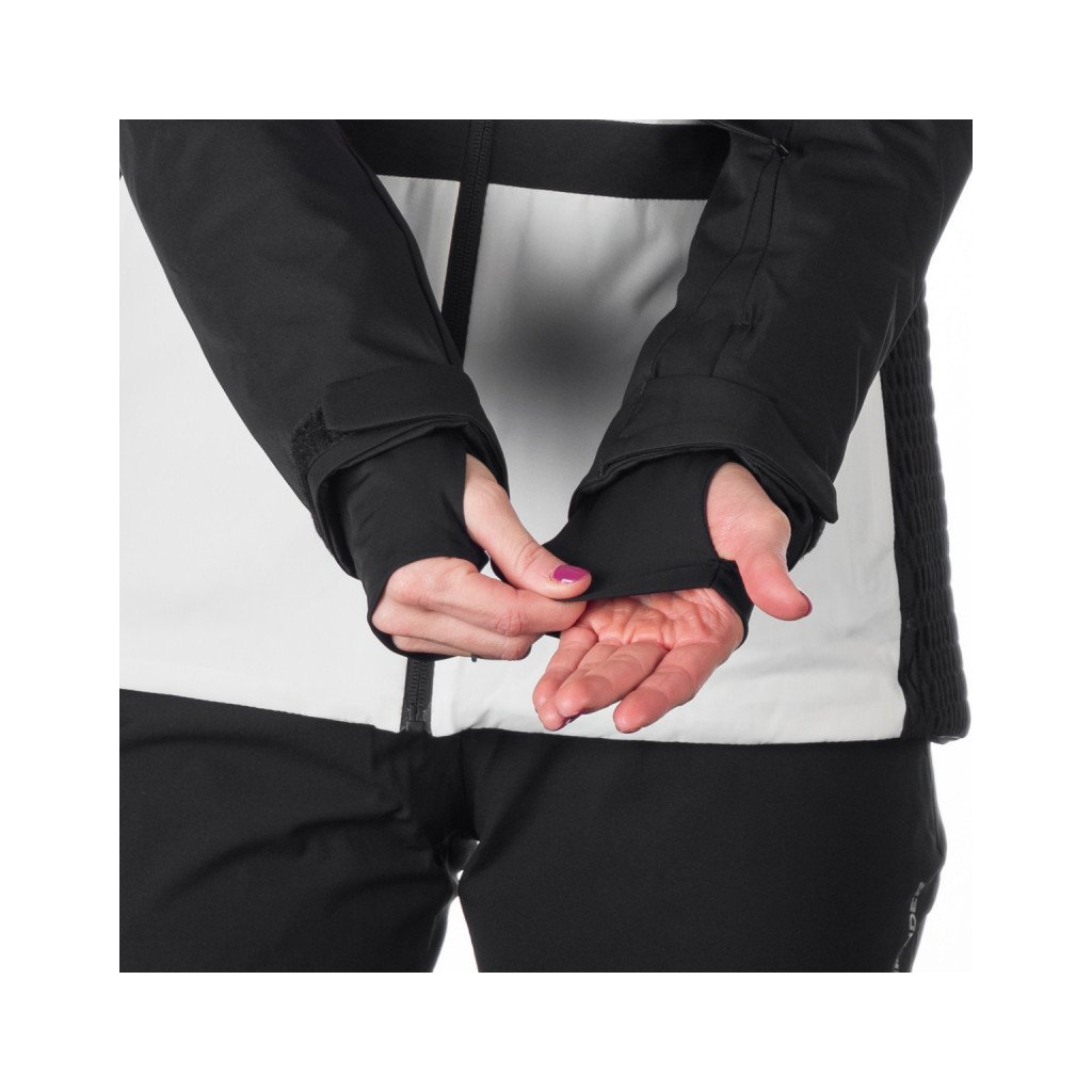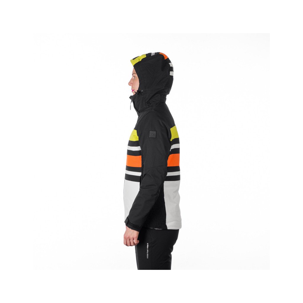 Dámská lyžařská bunda dokonale připravená pro zimní počasí, sněžení i vítr. Přináší trendový design spolu s pokročilými technickými funkcemi a pohodlím. Je vyrobena z vysoce strečového 2-vrstvého materiálu s membránou a hodnotami 10 000 mm H₂O / 10 000 g/m²/24 h, díky čemuž dobře odolává větru i vodě při zachování výborné prodyšnosti. Pro podporu vodoolnosti jsme podlepili kritické švy. Materiál byl navíc ošetřen ekologickou vodoodpudivou WR úpravou (PFC free). Tepelný komfort je navíc zapezpečen díky léze proti profouknutí pod zipem a sněhovému pásu, který chrání před vniknutím sněhu dovnitř bundy. Komfort při nošení zvyšují předtvarované rukávy a možnost nastavení obvodu rukávů na suchý zip s vnitřní vsadkou z lycry. Bunda je také vybavena nastavitelným pásem a možností regulace spodního okraje stahováním, můžete si tedy bundu přizpůsobit vašim potřebám. K dispozici jsou dvě praktické boční kapsy na zip, kapsa na rukávu na skipass a vnitřní hrudní kapsa na zip. Další vnitřní kapsa je určena k uložení lyžařských brýlí. Odnímatelná a nastavitelná 3D kapuce umožňuje přizpůsobení podle počasí a preferencí.