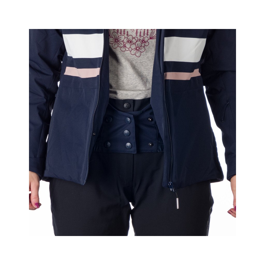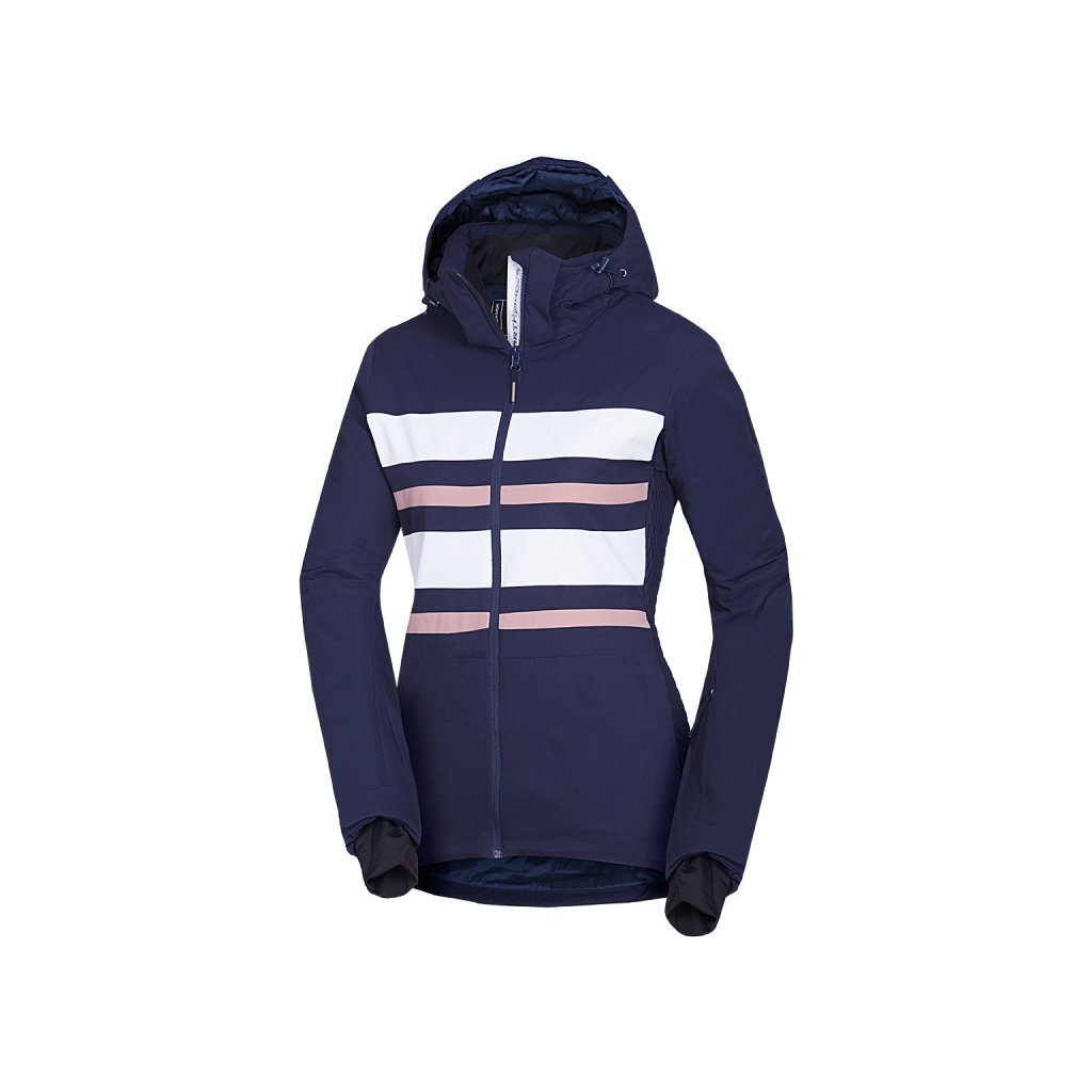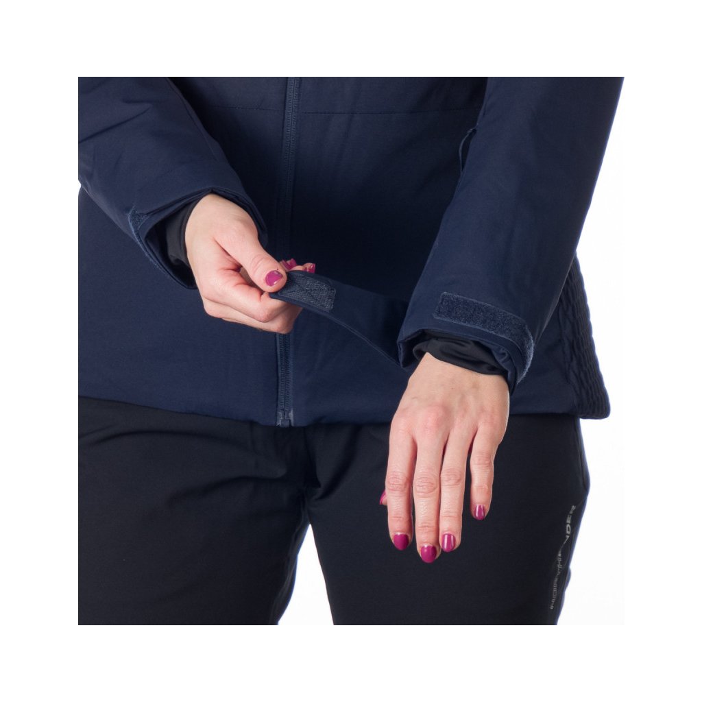 Dámská lyžařská bunda dokonale připravená pro zimní počasí, sněžení i vítr. Přináší trendový design spolu s pokročilými technickými funkcemi a pohodlím. Je vyrobena z vysoce strečového 2-vrstvého materiálu s membránou a hodnotami 10 000 mm H₂O / 10 000 g/m²/24 h, díky čemuž dobře odolává větru i vodě při zachování výborné prodyšnosti. Pro podporu vodoolnosti jsme podlepili kritické švy. Materiál byl navíc ošetřen ekologickou vodoodpudivou WR úpravou (PFC free). Tepelný komfort je navíc zapezpečen díky léze proti profouknutí pod zipem a sněhovému pásu, který chrání před vniknutím sněhu dovnitř bundy. Komfort při nošení zvyšují předtvarované rukávy a možnost nastavení obvodu rukávů na suchý zip s vnitřní vsadkou z lycry. Bunda je také vybavena nastavitelným pásem a možností regulace spodního okraje stahováním, můžete si tedy bundu přizpůsobit vašim potřebám. K dispozici jsou dvě praktické boční kapsy na zip, kapsa na rukávu na skipass a vnitřní hrudní kapsa na zip. Další vnitřní kapsa je určena k uložení lyžařských brýlí. Odnímatelná a nastavitelná 3D kapuce umožňuje přizpůsobení podle počasí a preferencí.
