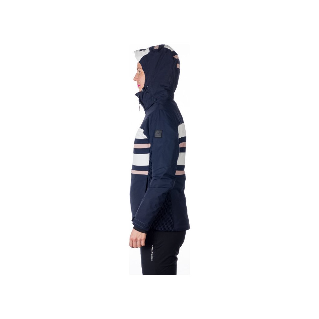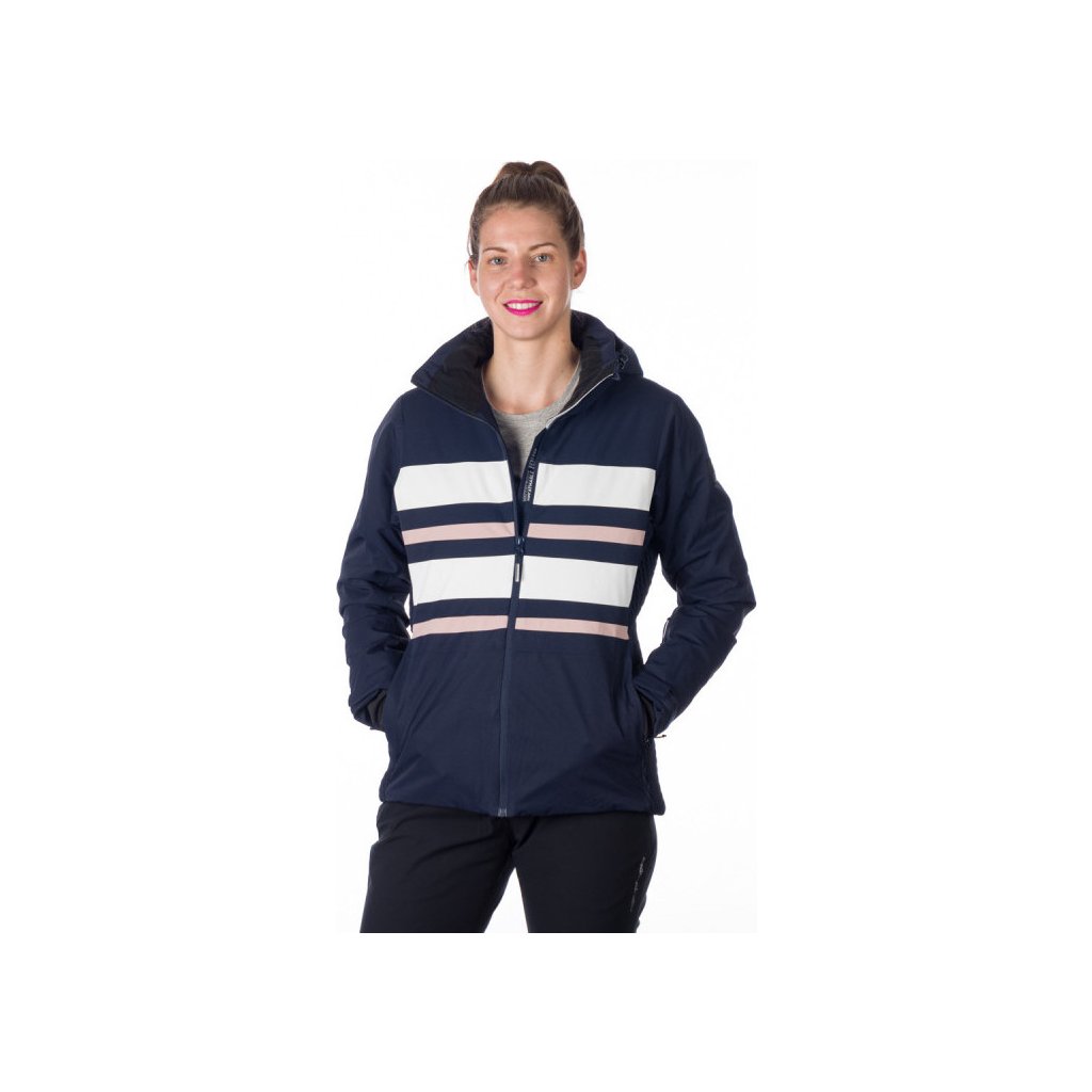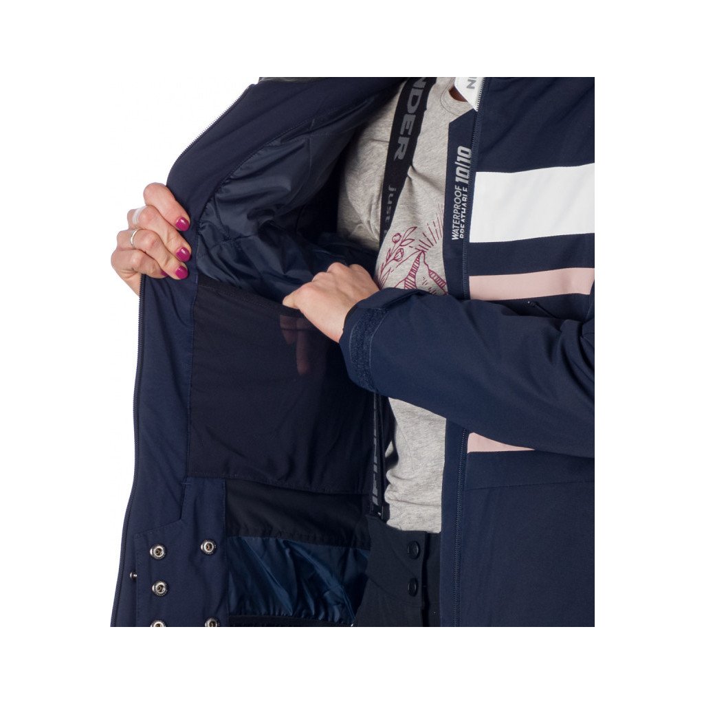 Dámská lyžařská bunda dokonale připravená pro zimní počasí, sněžení i vítr. Přináší trendový design spolu s pokročilými technickými funkcemi a pohodlím. Je vyrobena z vysoce strečového 2-vrstvého materiálu s membránou a hodnotami 10 000 mm H₂O / 10 000 g/m²/24 h, díky čemuž dobře odolává větru i vodě při zachování výborné prodyšnosti. Pro podporu vodoolnosti jsme podlepili kritické švy. Materiál byl navíc ošetřen ekologickou vodoodpudivou WR úpravou (PFC free). Tepelný komfort je navíc zapezpečen díky léze proti profouknutí pod zipem a sněhovému pásu, který chrání před vniknutím sněhu dovnitř bundy. Komfort při nošení zvyšují předtvarované rukávy a možnost nastavení obvodu rukávů na suchý zip s vnitřní vsadkou z lycry. Bunda je také vybavena nastavitelným pásem a možností regulace spodního okraje stahováním, můžete si tedy bundu přizpůsobit vašim potřebám. K dispozici jsou dvě praktické boční kapsy na zip, kapsa na rukávu na skipass a vnitřní hrudní kapsa na zip. Další vnitřní kapsa je určena k uložení lyžařských brýlí. Odnímatelná a nastavitelná 3D kapuce umožňuje přizpůsobení podle počasí a preferencí.