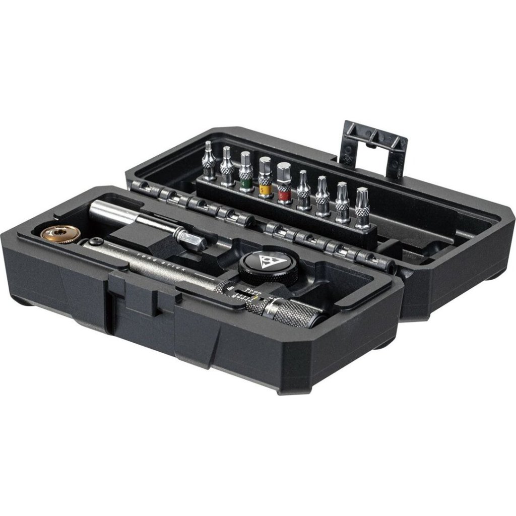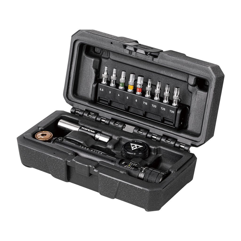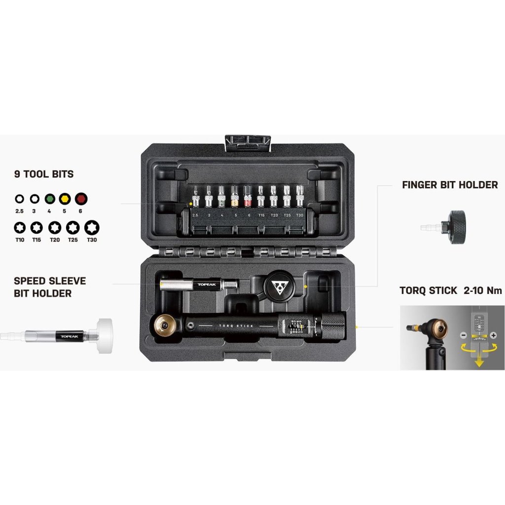 Sada cyklistického nářadí Torq Stick Pro ve verzi 2-10Nm. Momentový klíč s nastavitelným předvoleným rozsahem 2-10 Nm je vybaven standardní šestihrannou reverzibilní ráčnovou hlavou. Součástí je magnetický držák bitů pro zvýšení pákového efektu, držák bitů Finger Bit pro úzké prostory a 9 bitů s velkorysou délkou 30 mm pro dosažení náročných míst. Rýhování na jednotlivých bitech zlepšuje úchop při výměně nebo vyjímání z organizéru či ráčnové hlavy nástroje. Úhledné uložení v boxu.