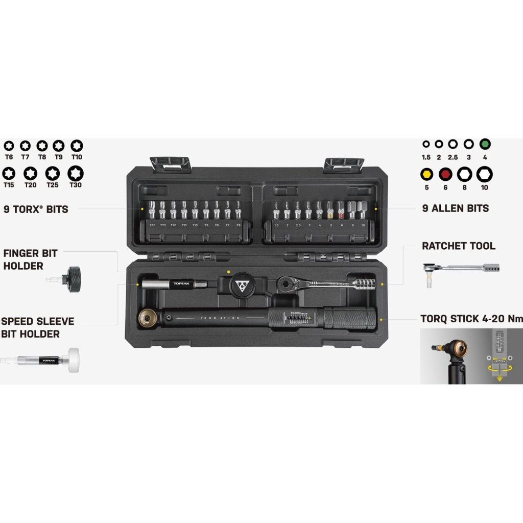 Sada cyklistického nářadí Torq Stick Pro ve verzi 4-20Nm. Momentový klíč s nastavitelným předvoleným rozsahem 4-20 Nm je vybaven standardní šestihrannou reverzní ráčnovou hlavou a jemným ozubeným ráčnovým mechanismem s reverzní pákou a kolečkem pro rychlé otáčení a kontrolu v úzkých místech. Součástí je magnetický držák bitů pro zvýšení pákového efektu, držák bitů pro úzké prostory a 18 bitů s velkorysou délkou 30 mm pro dosažení náročných míst. Rýhování na jednotlivých bitech dodává lepší úchop při výměně nebo vyjímání z organizéru či hlavy ráčny. Úhledné uložení v boxu.
