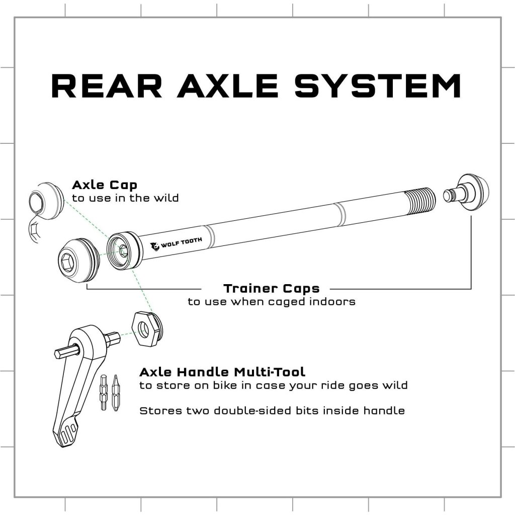 - Multiklíč byl navržen pro osy Wolf Tooth, i když je kompatibilní i s jinými osami, které mají závitový konec.