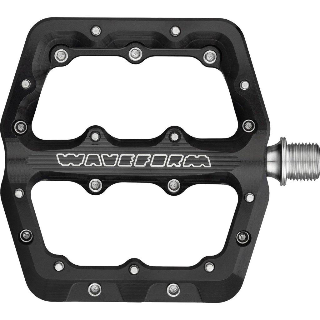 Hliníkové pedály Wolf Tooth Waveform jsou navrženy pro all-mountain jízdu od XC až po sjezd. Jsou dostupné ve dvou velikostech, přizpůsobené pro optimální oporu a kontakt s botou. Mají tenký, dvouklenutý profil – 14 mm na okrajích a 12,5 mm ve středu – což zajišťuje lepší stabilitu. Každá strana pedálu obsahuje 11 nerezových pinů pro maximální trakci. Zkosená přední hrana pomáhá odklánět nárazy do překážek. Pedály jsou vybaveny třemi plně utěsněnými ložisky a vlastním radiálním těsněním, které chrání vnitřní komponenty před vodou, nečistotami a blátem.