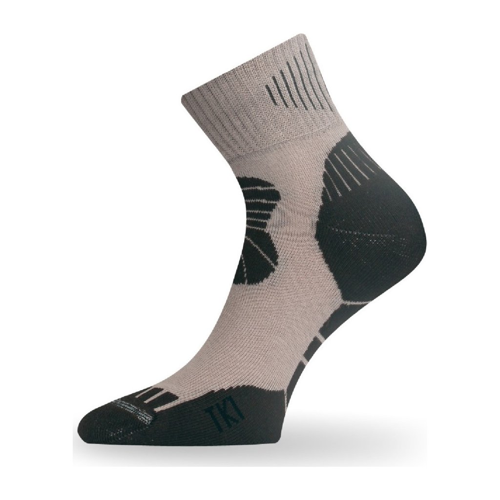 TKI kotníková trekingová ponožka obsahující bavlnu a speciální polypropylenové příze s obsahem iontů stříbra, které zpomalují růst bakterií a plísní, potlačuje nepříjemné pachy a udržuje rovnováhu pokožky. Ponožka je upravena pro zlepšenou ochranu proti puchýřům a tepelnou izolaci. Horní část ponožky je z jednovrstvého hladkého úpletu. V celém chodidle je dvouvrstvý plyš, což má za následek vysokou mechanickou odolnost a ochranu nohy před otlaky. Ve špičce se nachází ochranná zóna, v nadnártní části je zóna podporující dopředný náklon.