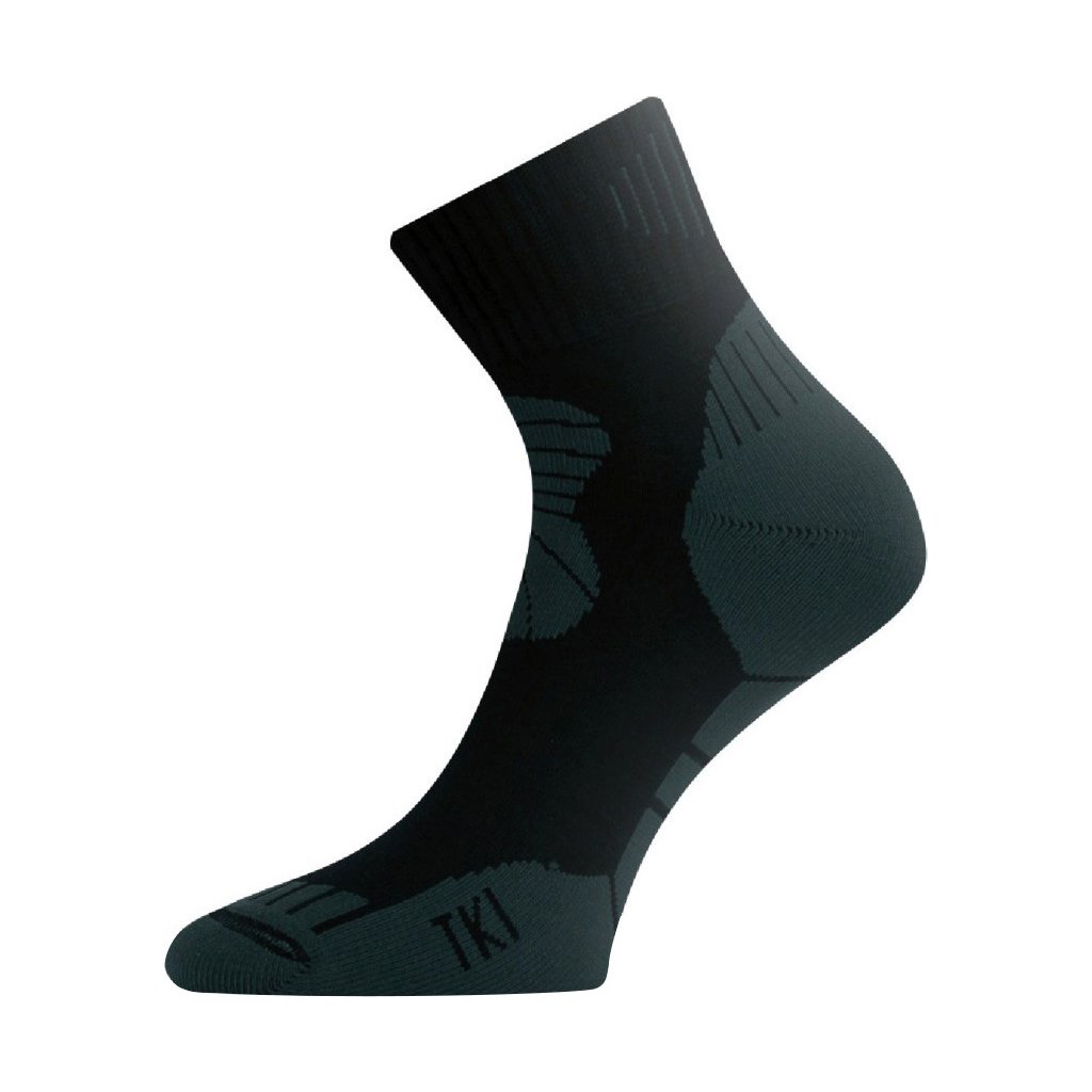 TKI kotníková trekingová ponožka obsahující bavlnu a speciální polypropylenové příze s obsahem iontů stříbra, které zpomalují růst bakterií a plísní, potlačuje nepříjemné pachy a udržuje rovnováhu pokožky. Ponožka je upravena pro zlepšenou ochranu proti puchýřům a tepelnou izolaci. Horní část ponožky je z jednovrstvého hladkého úpletu. V celém chodidle je dvouvrstvý plyš, což má za následek vysokou mechanickou odolnost a ochranu nohy před otlaky. Ve špičce se nachází ochranná zóna, v nadnártní části je zóna podporující dopředný náklon.