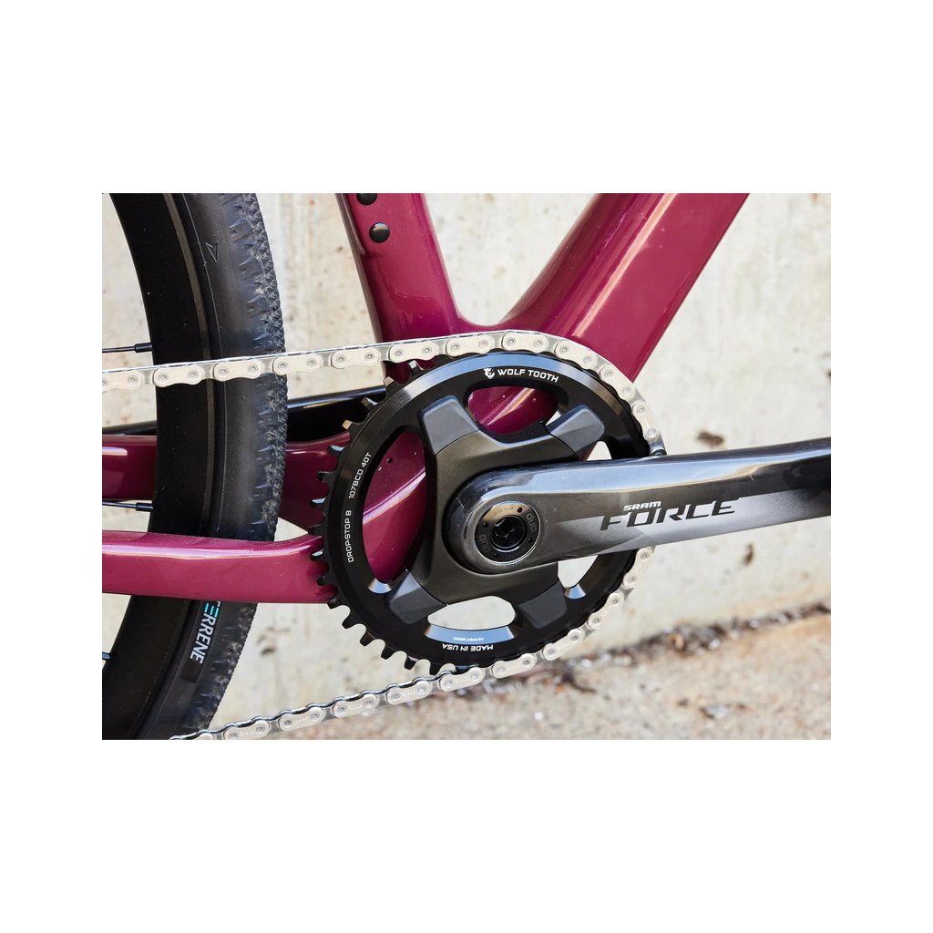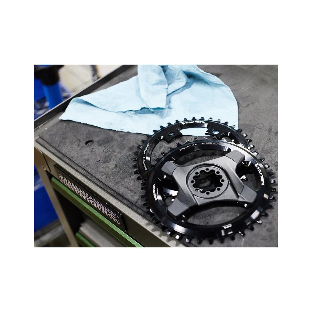 Převodník Wolf Tooth standartu 107 BCD je kompatibilní s klikami SRAM 1x, které používají spider 107 BCD, včetně SRAM AXS Power Meter Spider. Tento převodník využívá patentovaný profil zubů Wolf Tooth Drop-Stop B Wide/Narrow.