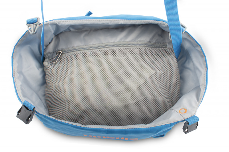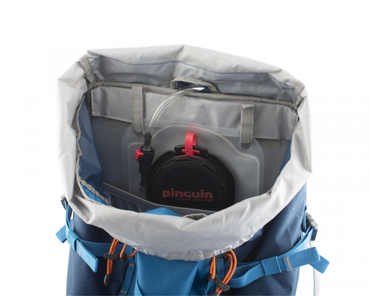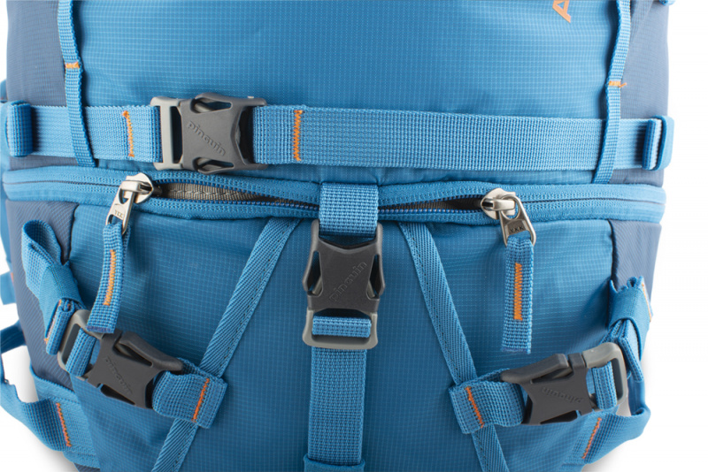 Dvě komory pro oddělení přepravovaného vybavení podle četnosti jeho používání, možnost propojení obou komor v jednu rozepnutím přepážky. Snadno odepínatelné prostorné víko batohu se dá použít jako ledvinka nebo taška přes rameno. Vnější zipová kapsa na víku vhodná k uložení rychle dostupného vybavení (např. lékárny) a potravy. Síťovaná zipová kapsa na vnitřní straně víka na cennosti s karabinkou na klíče. Středový kompresní popruh pod víkem vhodný k fixaci lana. Přepážka oddělující vodní vak od dalšího převáženého vybavení uvnitř hlavní komory. Zip spodní komory je jištěn samostatným popruhem se sponou.