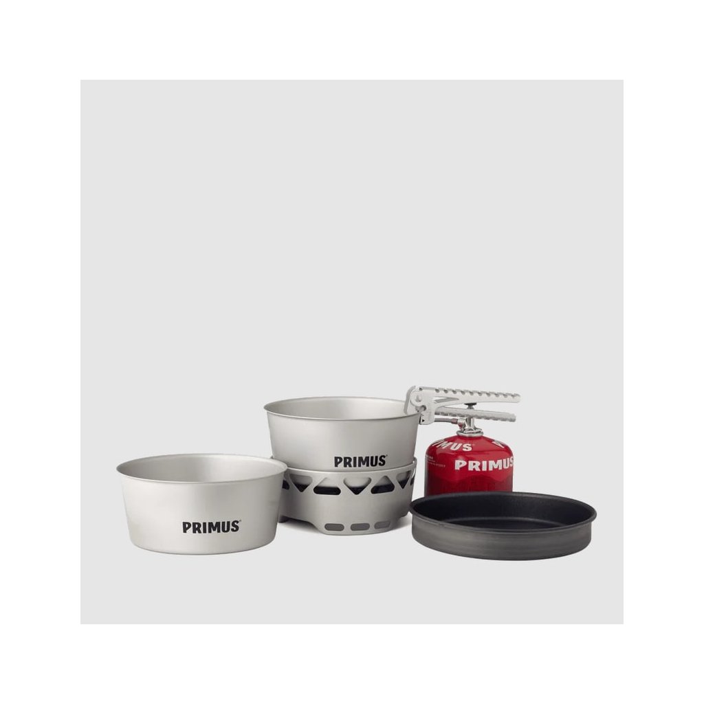 PRIMUS Essential Stove Set 1,3 L je praktický vařič integrovaný do stabilní základny, která funguje jako závětří. V setu s vařičem jsou dva hliníkové hrnce a poklice použitelná jako pánev. Každý hrnec má objem 1,3 l a pro manipulaci s nimi jsou přiloženy kleště.